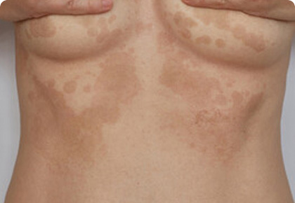 주로 상반신 다양한 부위에 여러 크기의 얼룩덜룩한 반점 형태의 병변이 발생합니다.